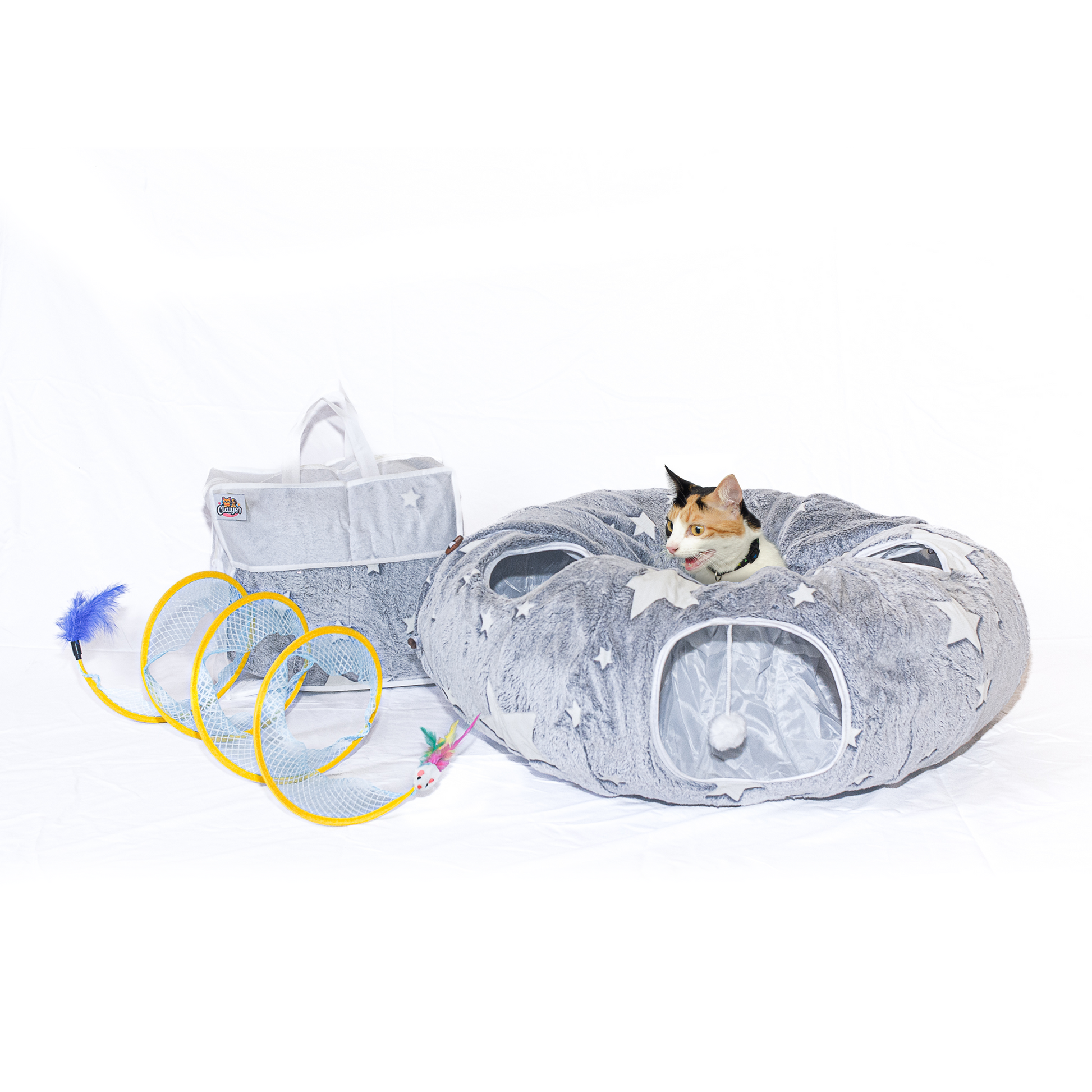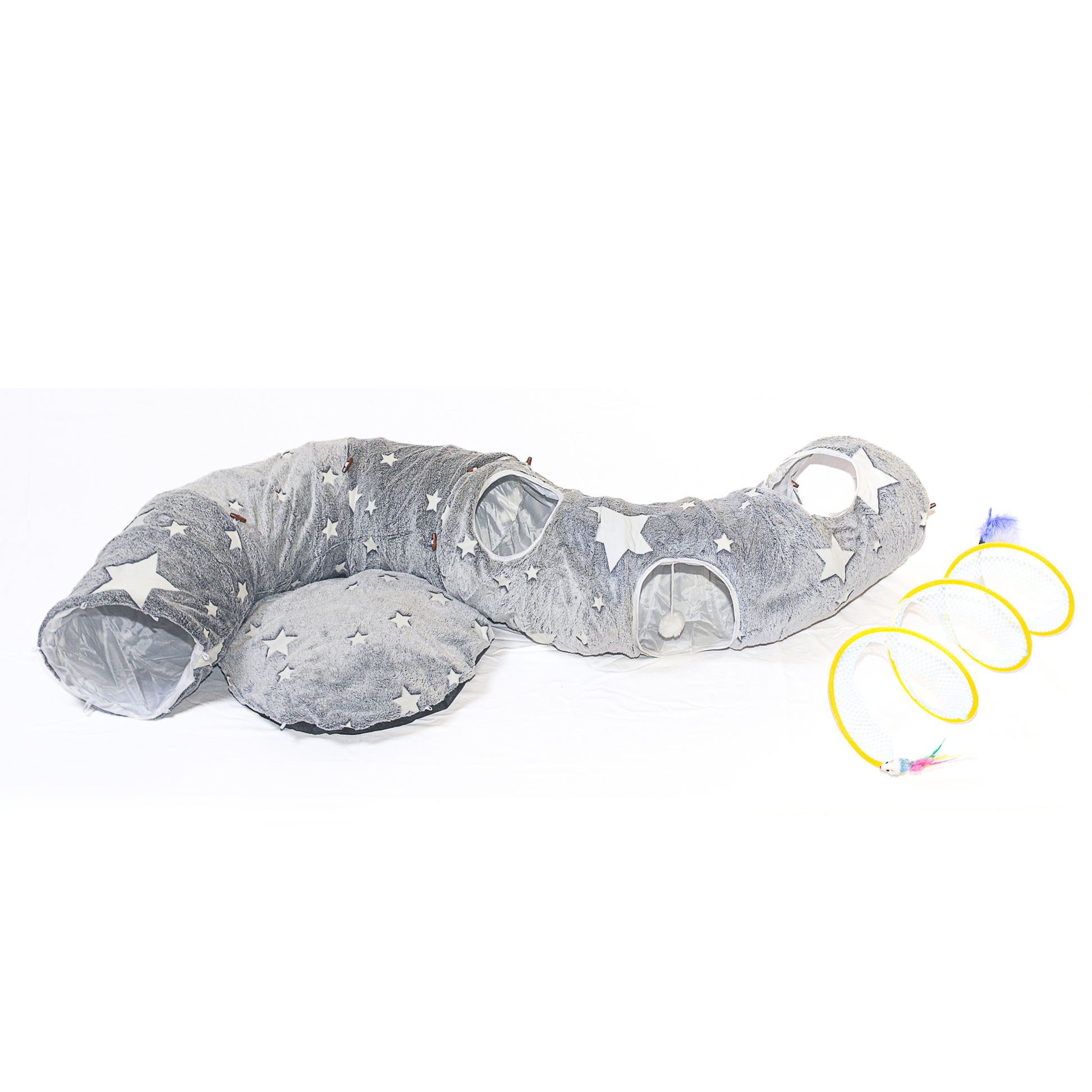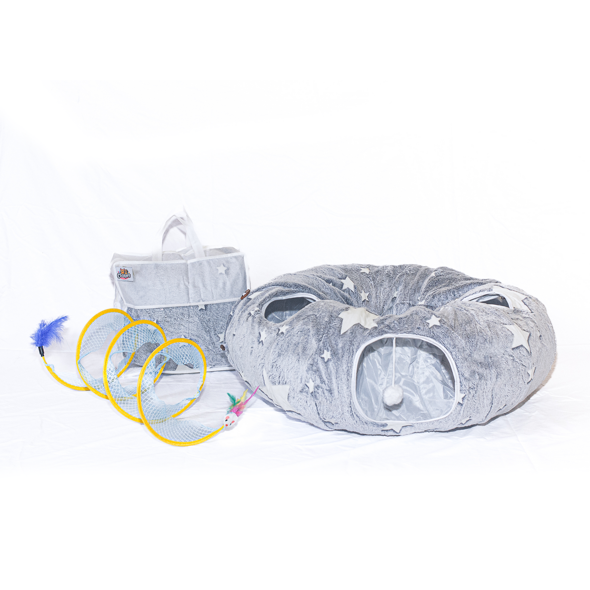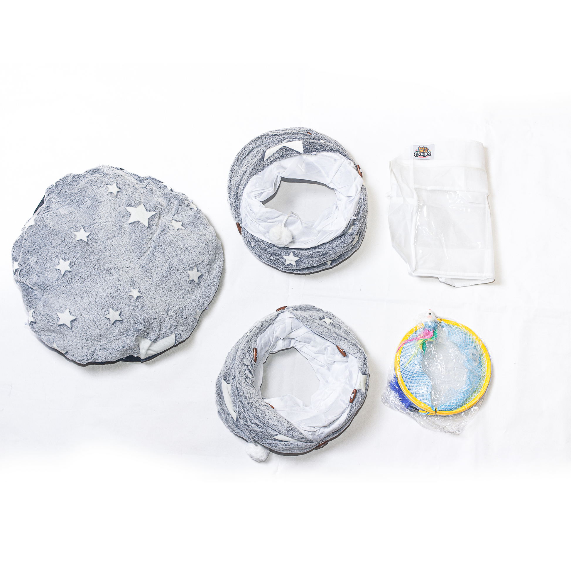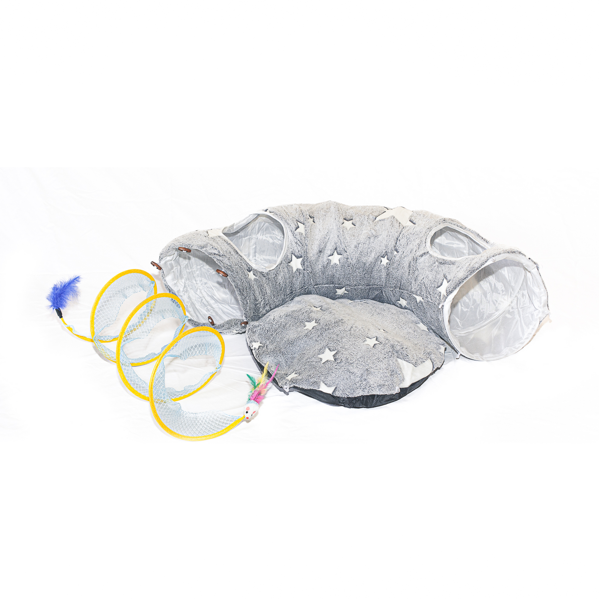 Your pet’s comfort is ensured with the plush, moon-shaped central bed, which provides a soft and secure resting area. The central bed is machine-washable, making it easy to maintain cleanliness and comfort, while the rest of the tunnel creates an engaging space for both play and relaxation.